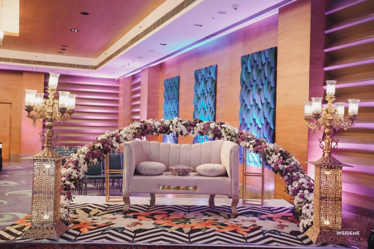 Elegant engagement at Novotel Hyderabad with premium floral backdrop, synchronized ring ceremony flow, and smooth vendor coordination for flawless event timing.
