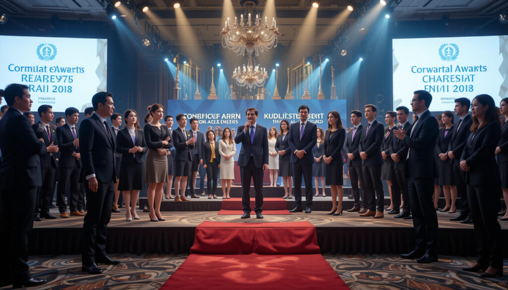 A prestige-driven award night with thematic stage setup, spotlight sequences, trophy presentation moments, and dynamic host anchoring