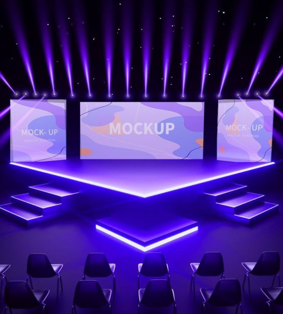 Smart stage design with seating, branding panels, and AV integration for a premium knowledge-sharing atmosphere