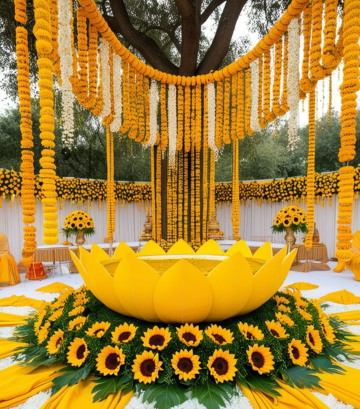 Bright marigold and jasmine backdrops styled with cultural patterns for joyful and visually rich rituals.