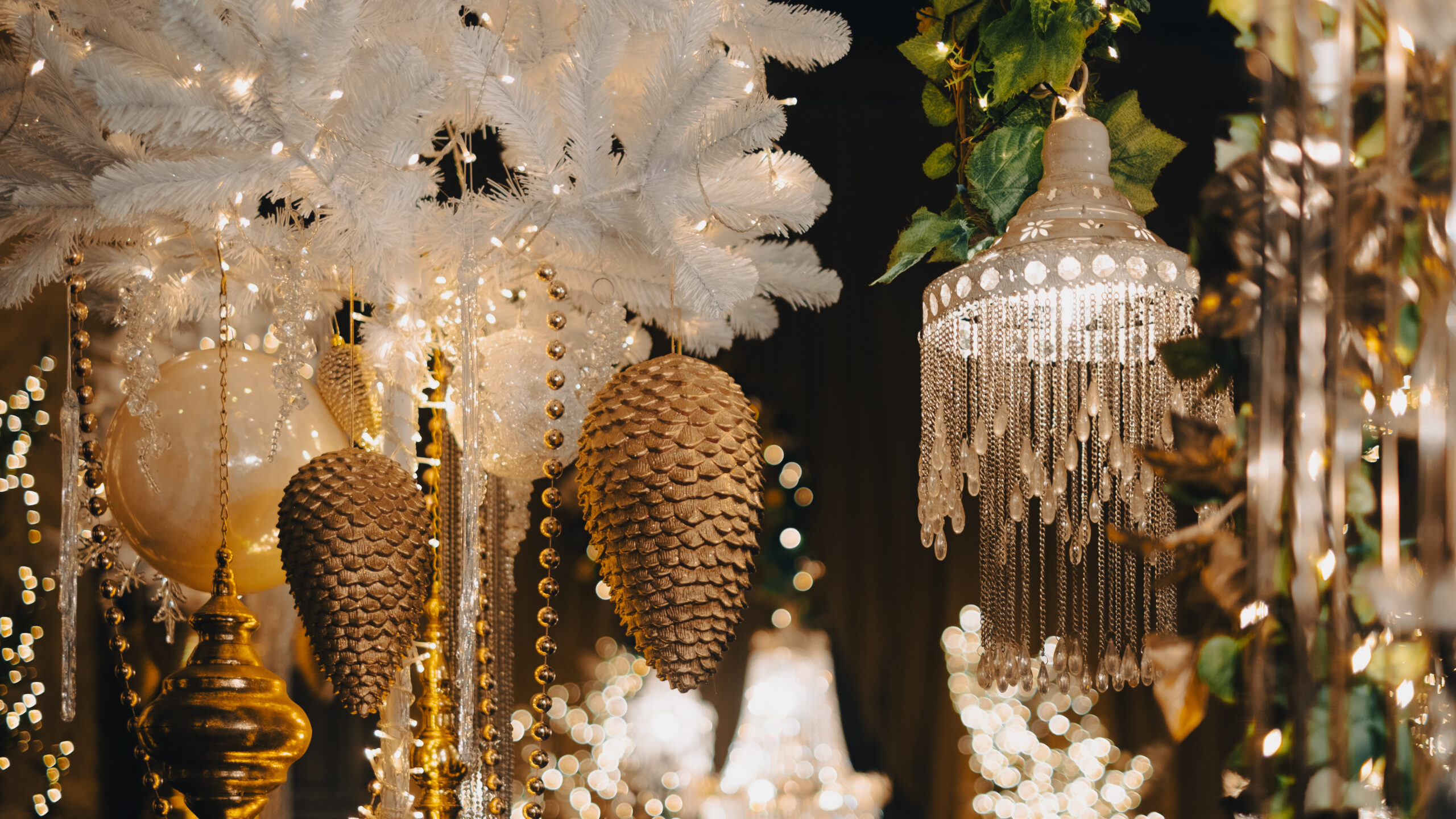 Hanging florals, chandeliers, and fabric accents adding grandeur to the overall setting.