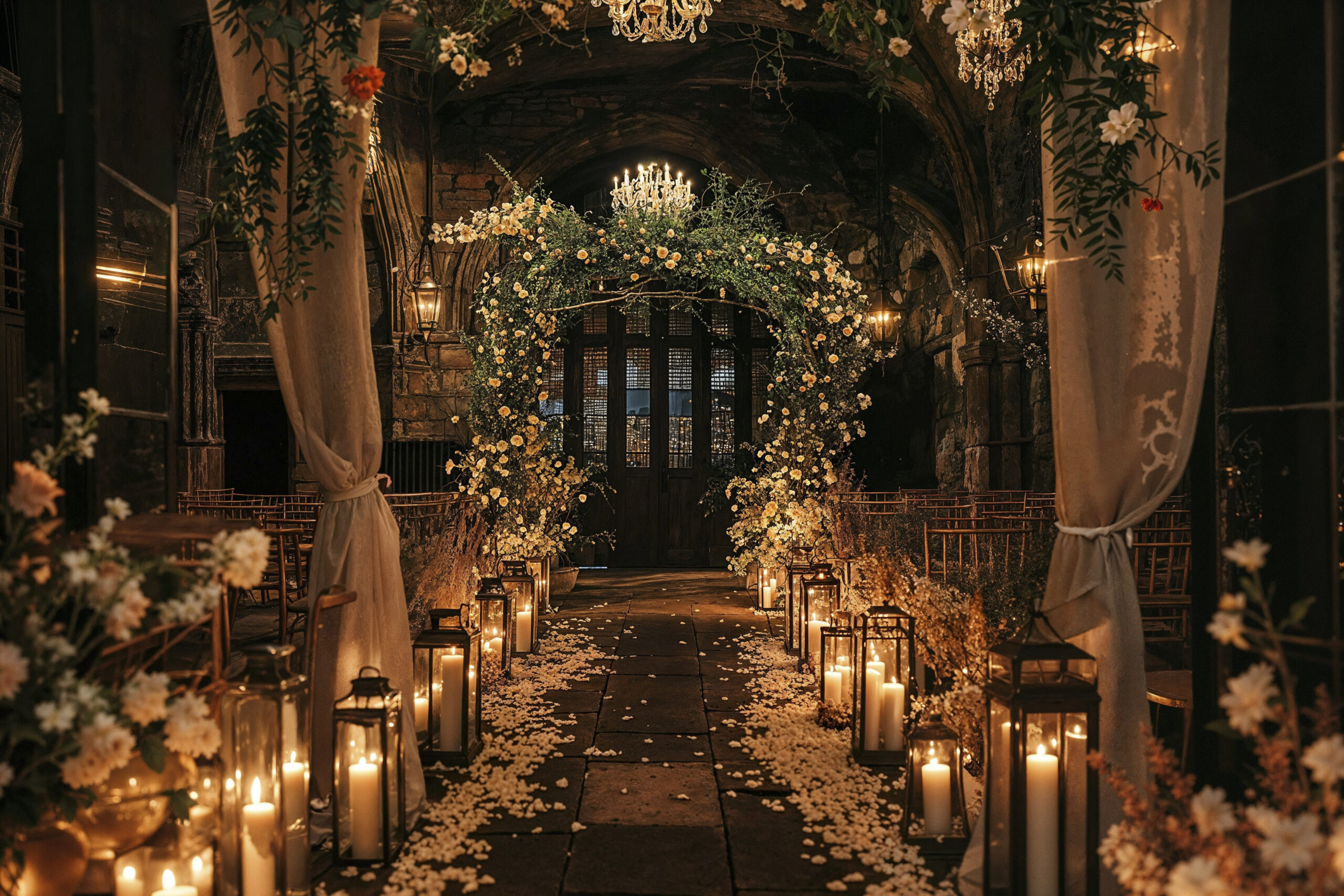 Elegant entry arches, floral pathways, and themed decor setting a majestic tone.