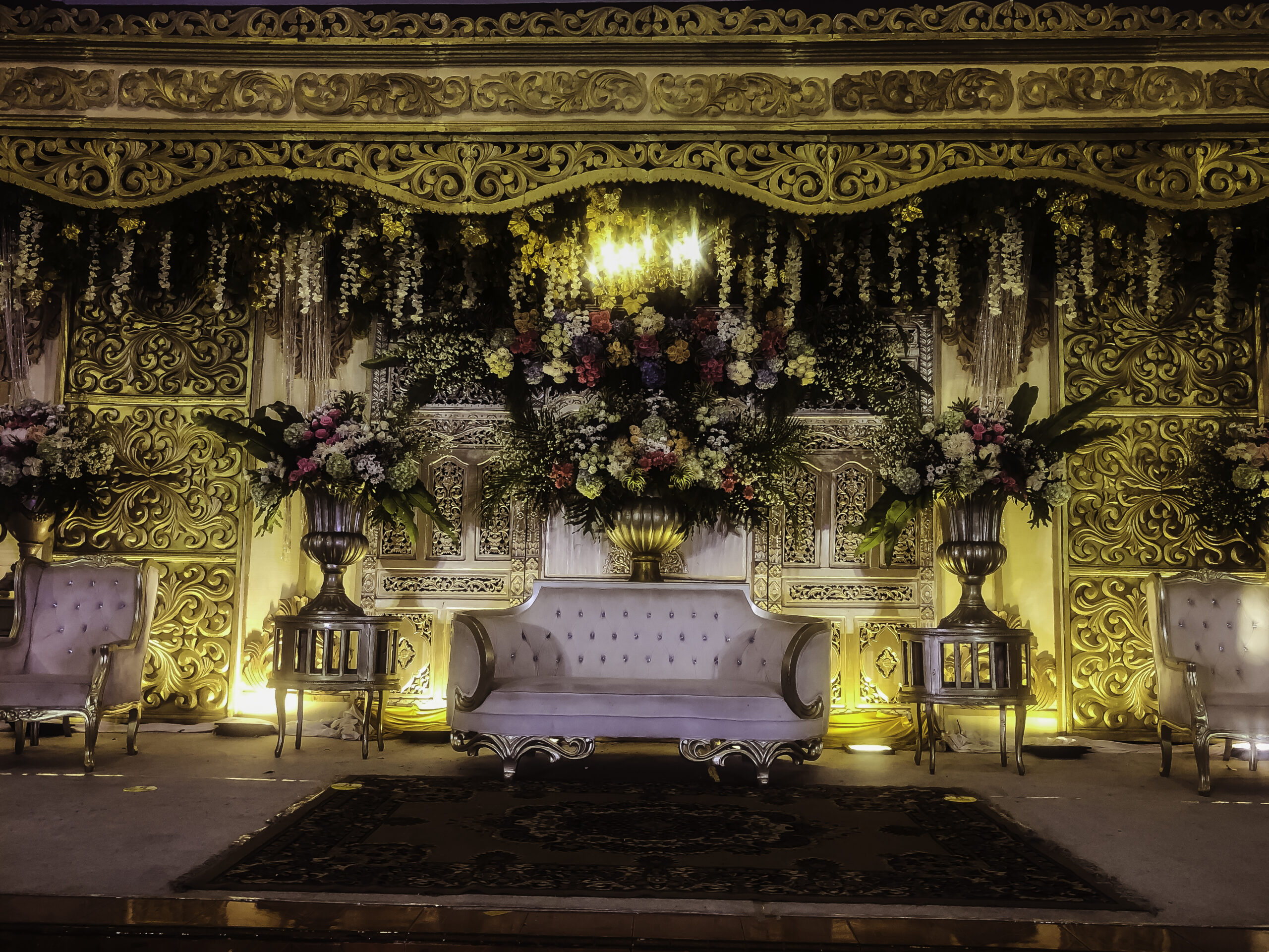 Grand stage designs featuring florals, metallic structures, and premium artistry for an elegant reception presence.