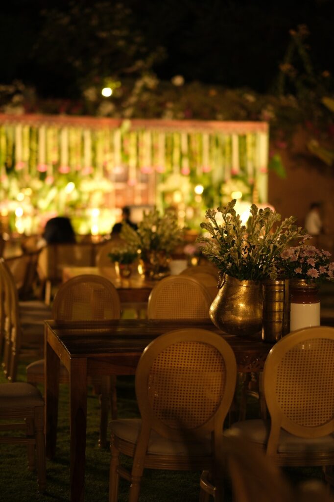 Elegant seating tables decorated with flowers, runners, candles, and theme-matched centerpieces for a luxury visual experience.