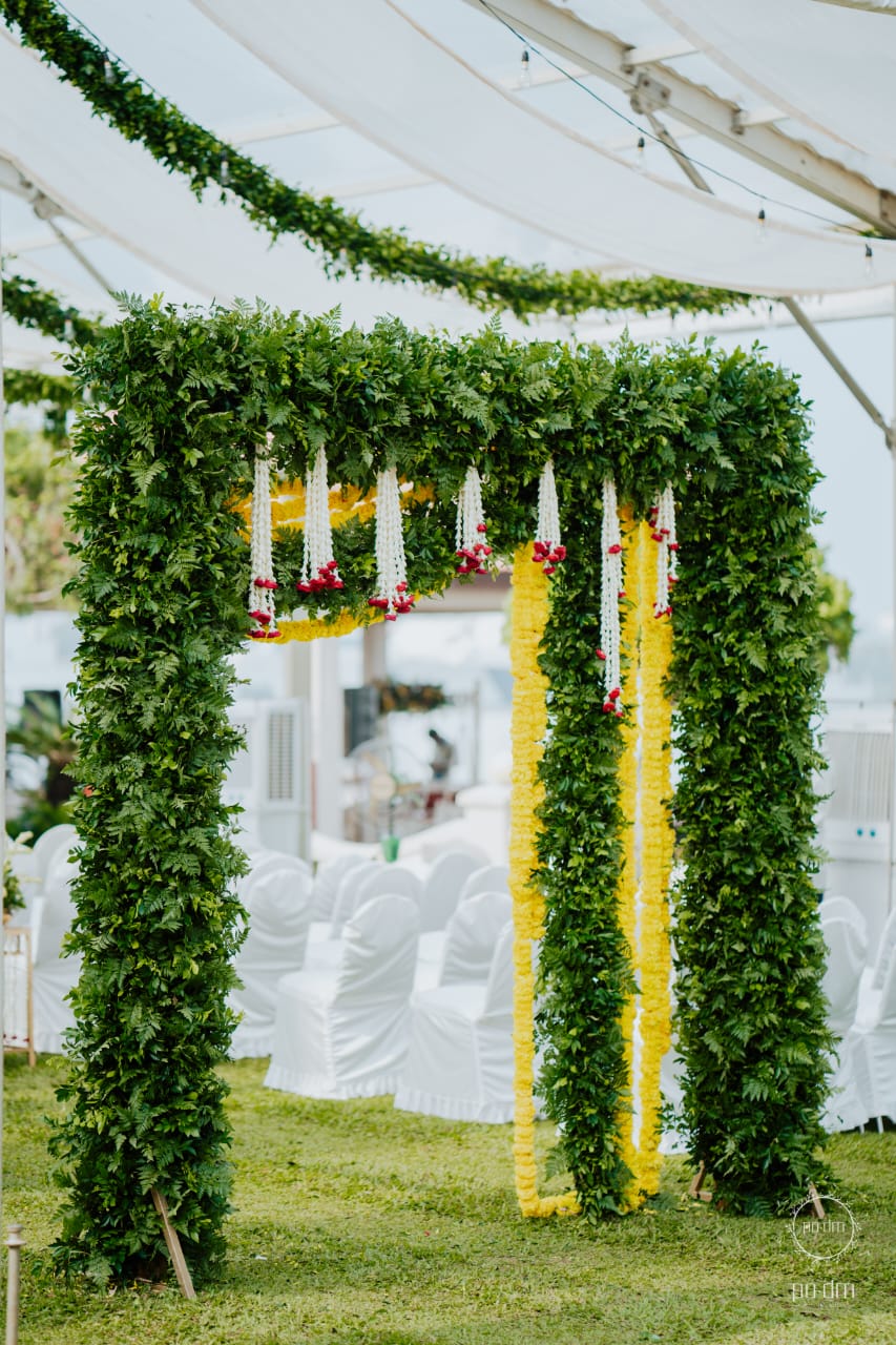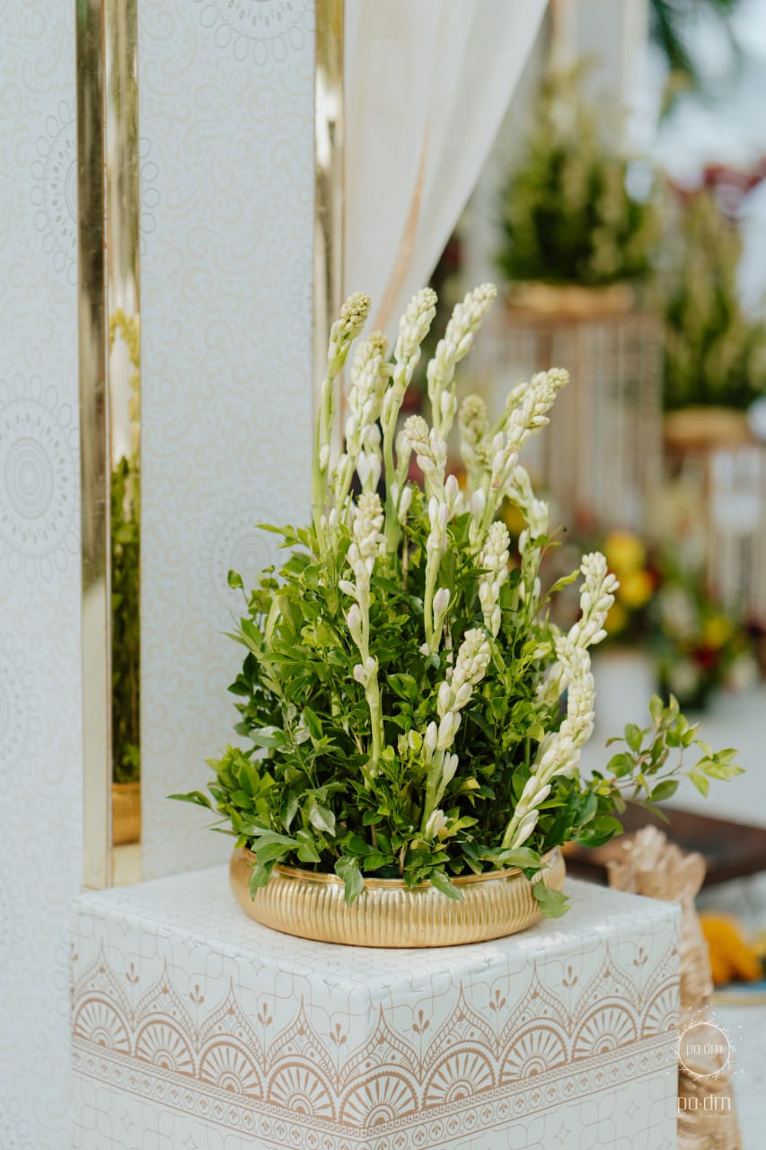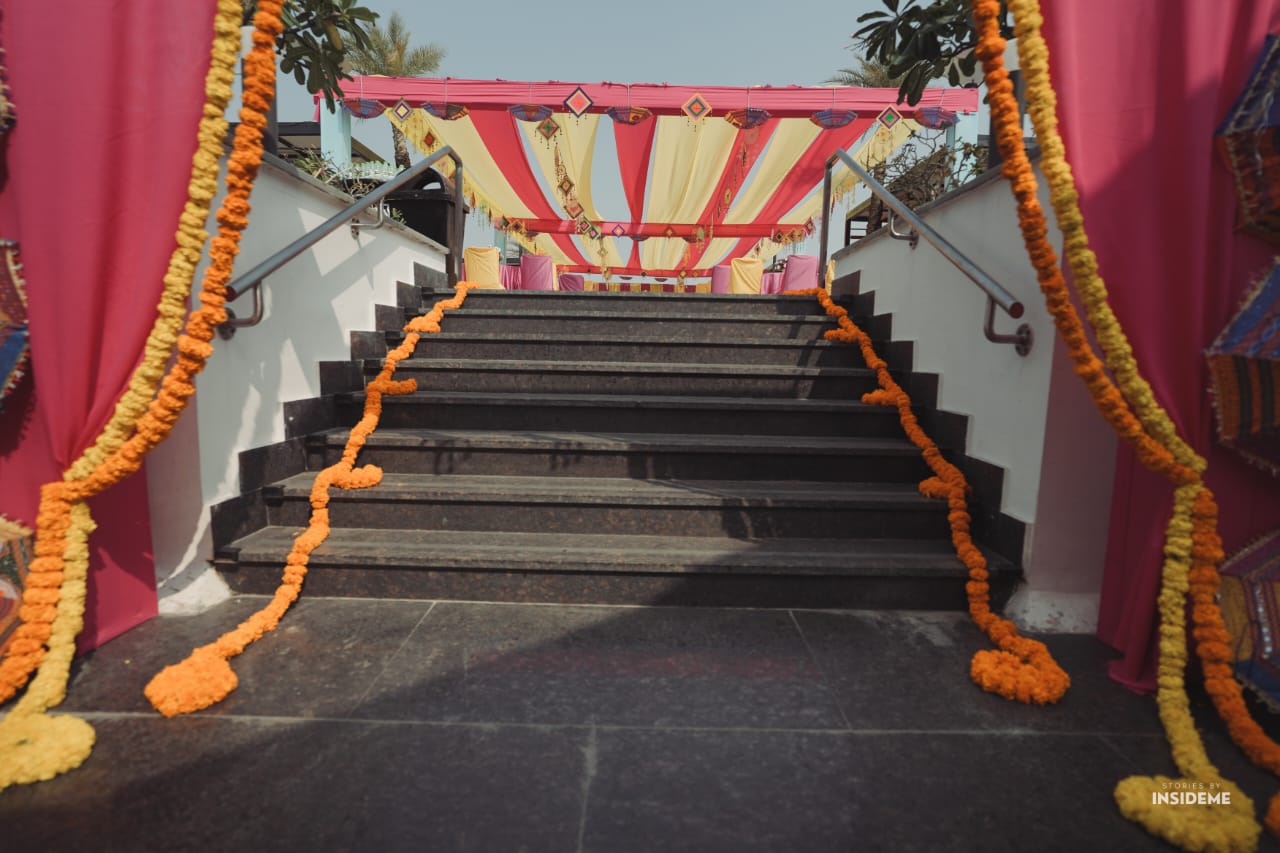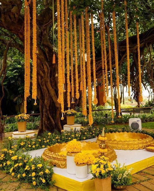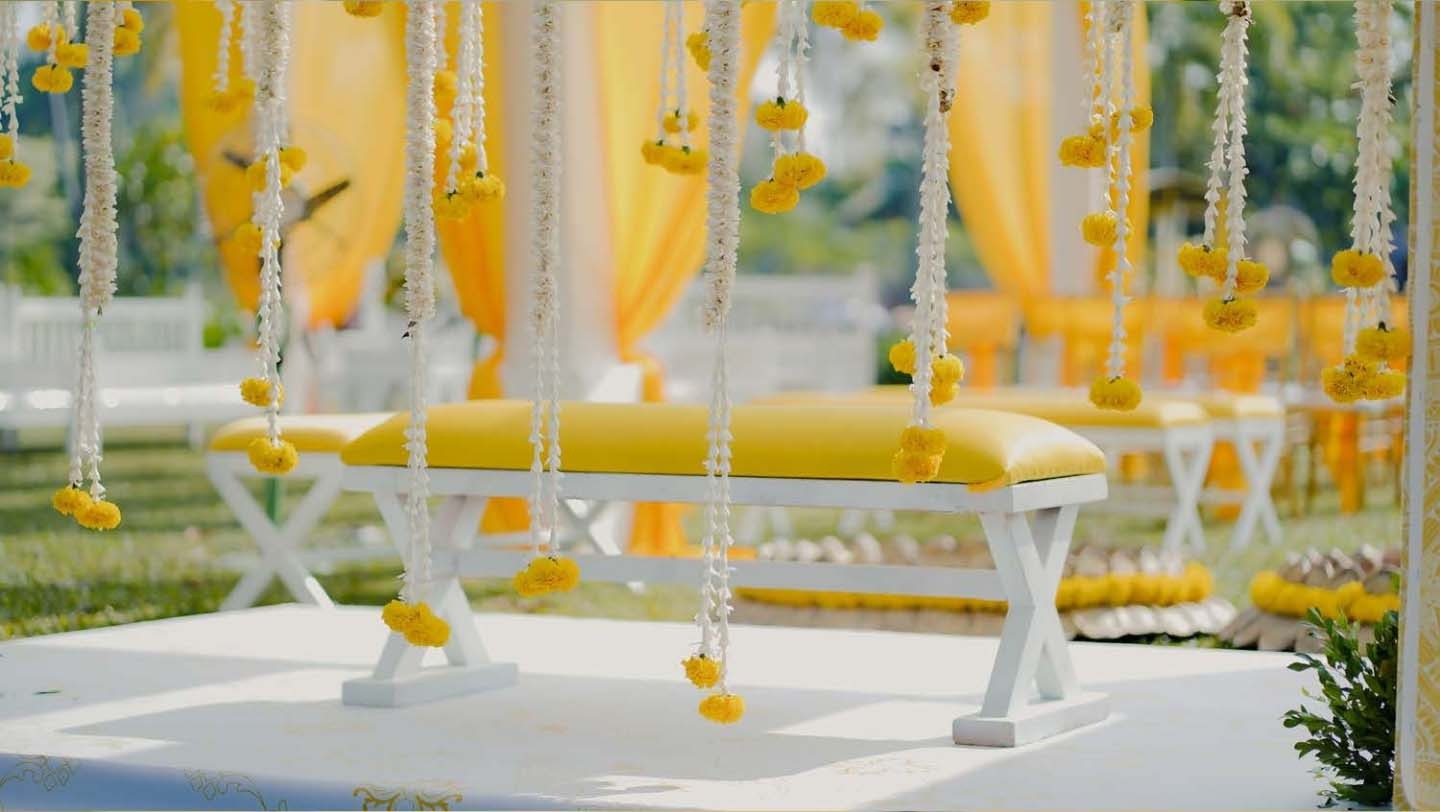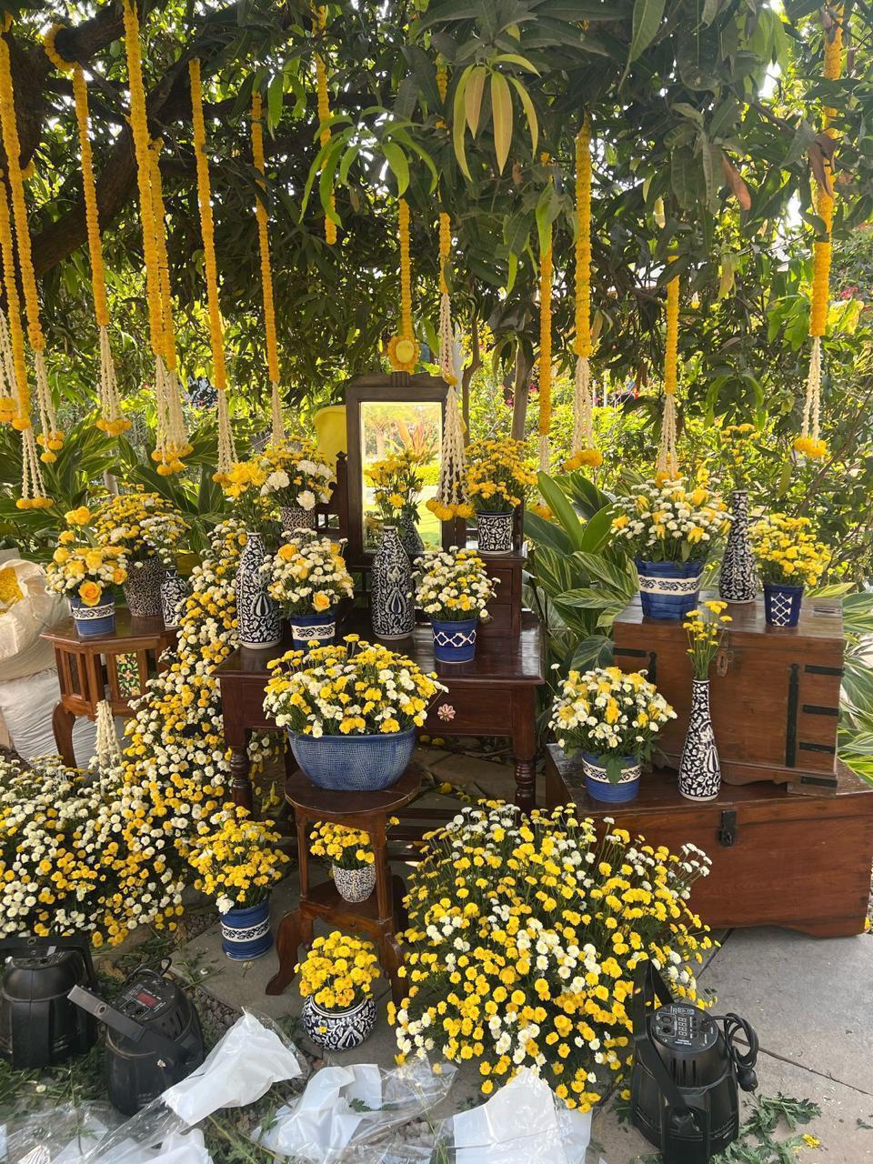 Bright yellow marigolds, coconut leaf backdrops, clay pots, and turmeric-themed props created a joyful traditional haldi décor full of festive energy.