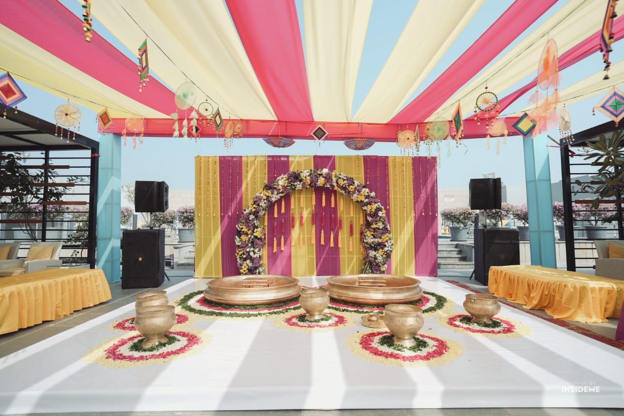 Colorful cushions, Rajasthani umbrellas, floral swings, and boho-chic seating turned the mehendi ceremony into a lively celebration with ethnic charm.